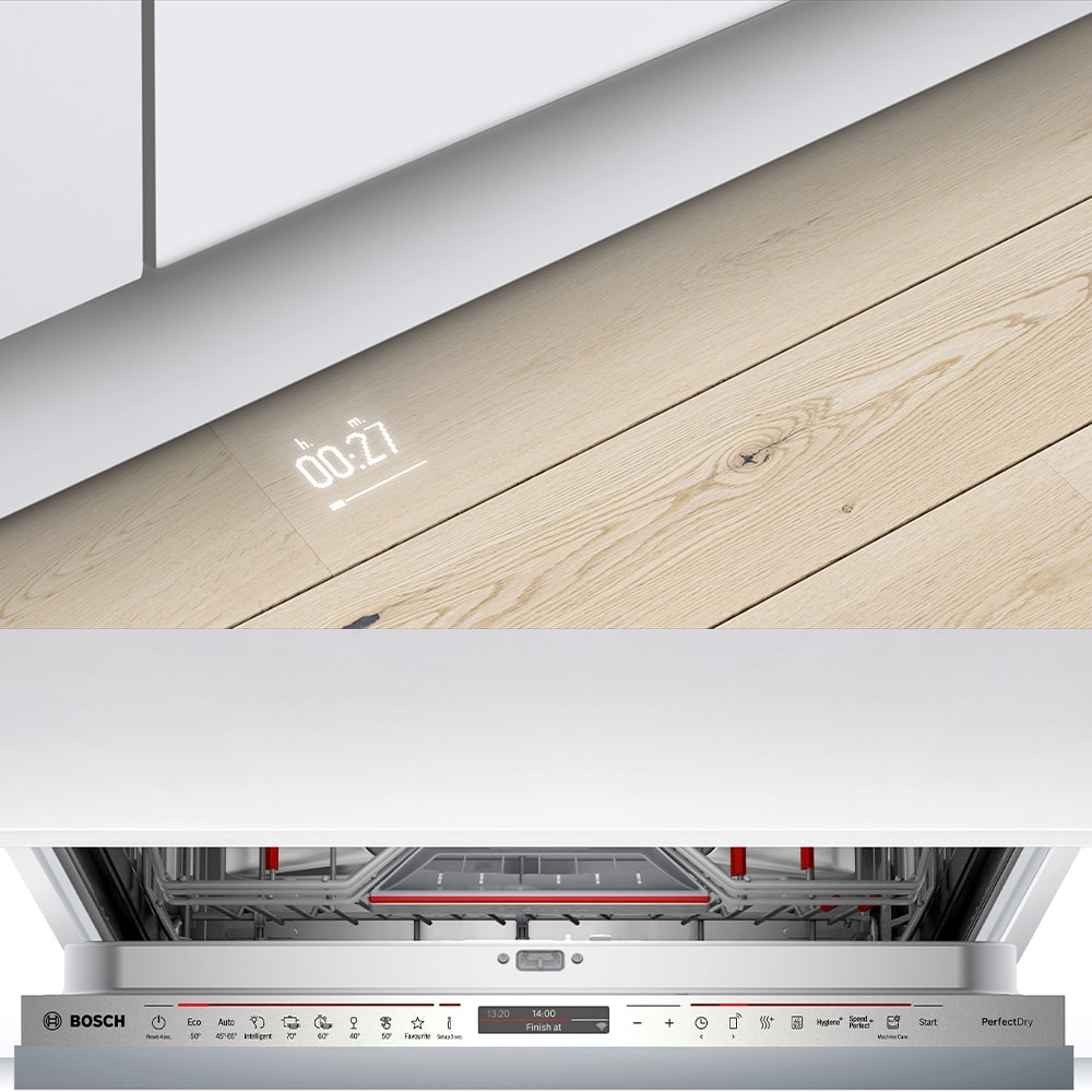 طراحی ظاهری ظرفشویی توکار بوش مدل SMV8YCX03E سری ۸ بسیار خاص و منحصر به فرد می باشد و پنل مربوطه به کنترل دستگاه داخل درب در نظر گرفته شده که فقط هنگام باز کردن درب قابل مشاهده است. سمت راست پنل گزینه هایی مانند شستشوی بهداشتی، تاخیر در شستشو و . . . ، در سمت چپ برنامه های شستشو و در بخش وسط صفحه نمایشی جهت نشان دادن مدت زمان شستشو، زمان باقی مانده و . . . نشان داده می شود.